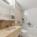 La deuxième chambre, la chambre à coucher principale, séduit par sa généreuse superficie, offrant ainsi un espace de repos confortable. L’un de ses atouts majeurs est la salle de bain attenante, équipée d’une baignoire et d’une douche intégrée. Cette connexion directe garantit une intimité optimale et confère une touche exclusive à cet espace.