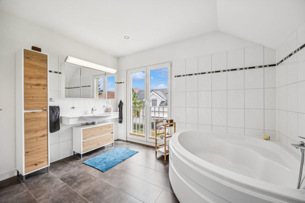 Über die stilvolle Treppe gelangen Sie Obergeschoss, das mit drei Schlafzimmern, einem grosszügigen Badezimmer mit Badewanne und Dusche sowie einer separaten Ankleide viel Raum für Privatsphäre und Rückzug bietet.