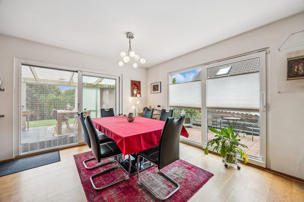 Der Aussenbereich besticht durch seine Grosszügigkeit und liebevolle Gestaltung. Auf dem 1’089 Quadratmeter grossen Grundstück befinden sich ein gepflegter Garten, eine überdachte Pergola mit Lamellendach und seitlichen Markisen, ein Biotop, ein Gartenhaus sowie zwei Geräteräume für Werkzeuge und Fahrräder. Hier findet jede Jahreszeit ihren Platz – vom Grillabend im Sommer bis zur winterlichen Ruheoase mit Ausblick. Photovoltaikanlage, Wärmepumpe mit Erdsonde und eine Ladestation für E-Autos unterstreichen den zukunftsfähigen und nachhaltigen Charakter der Immobilie.