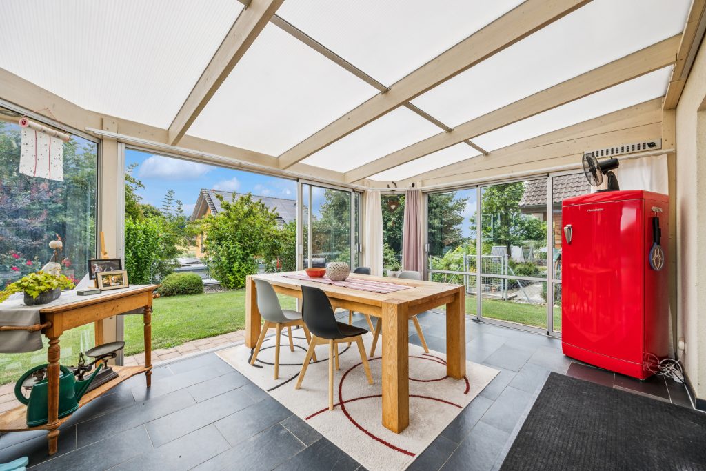 Beim Betreten des Hauses werden Sie von einem hellen, einladenden Eingangsbereich empfangen, der durch seine grosszügige Gestaltung genügend Platz für eine Garderobe bietet. Der zentrale Flur führt direkt in den weitläufigen Wohn-, Ess- und Kochbereich, der sich mit fast 52 Quadratmetern grosszügig präsentiert. Edler Parkettboden, ein Schwedenofen und viel Tageslicht schaffen eine warme Atmosphäre. Die moderne Küche überzeugt mit Granitabdeckung, hochwertigen Geräten und einer durchdachten Anordnung – ideal für gesellige Kochabende oder den morgendlichen Kaffee. Ein Highlight ist der angrenzende Wintergarten: Mit seinen 15 Quadratmetern gestattet er zusätzlichen Wohnraum, der ganzjährig genutzt werden kann. Ein weiteres Zimmer sowie ein Badezimmer mit Dusche und ein separater Geräteraum runden das Erdgeschoss ab.
