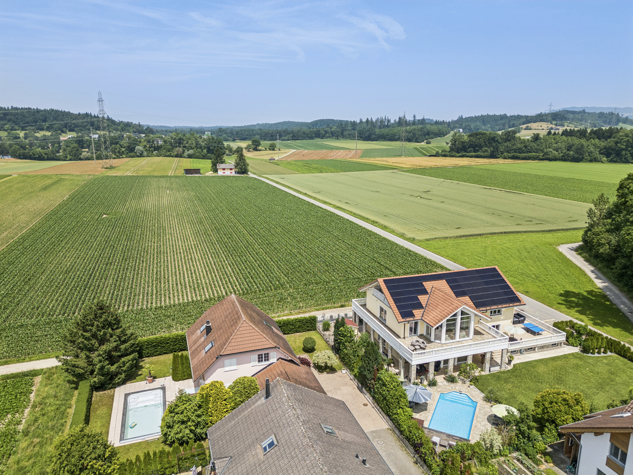 Villa in Gurbrü BE | Dieses exklusive 8.5-Zimmer-Domizil in Gurbrü vereint ländliche Ruhe, moderne Architektur und grosszügigen Wohnkomfort auf höchstem Niveau. Umgeben von Feldern, Wäldern und sanften Hügelzügen, beeindruckt die Residenz mit offener Raumgestaltung, stilvollem Innenausbau und einem traumhaften Aussenbereich mit Pool, Outdoor-Küche und gepflegtem Garten. Die lichtdurchfluteten Wohnräume, ein separates Büro, mehrere Schlafzimmer und ein ausgebautes Dachgeschoss schaffen Raum für Familie, Rückzug und Inspiration. Ein grosszügiges Grundstück (1’170 m²), 13 Parkmöglichkeiten und raffinierte Details wie Natursteinfassade, Galerie oder integrierte Bar im Untergeschoss machen dieses Anwesen zu einer echten Rarität im Berner Seeland.