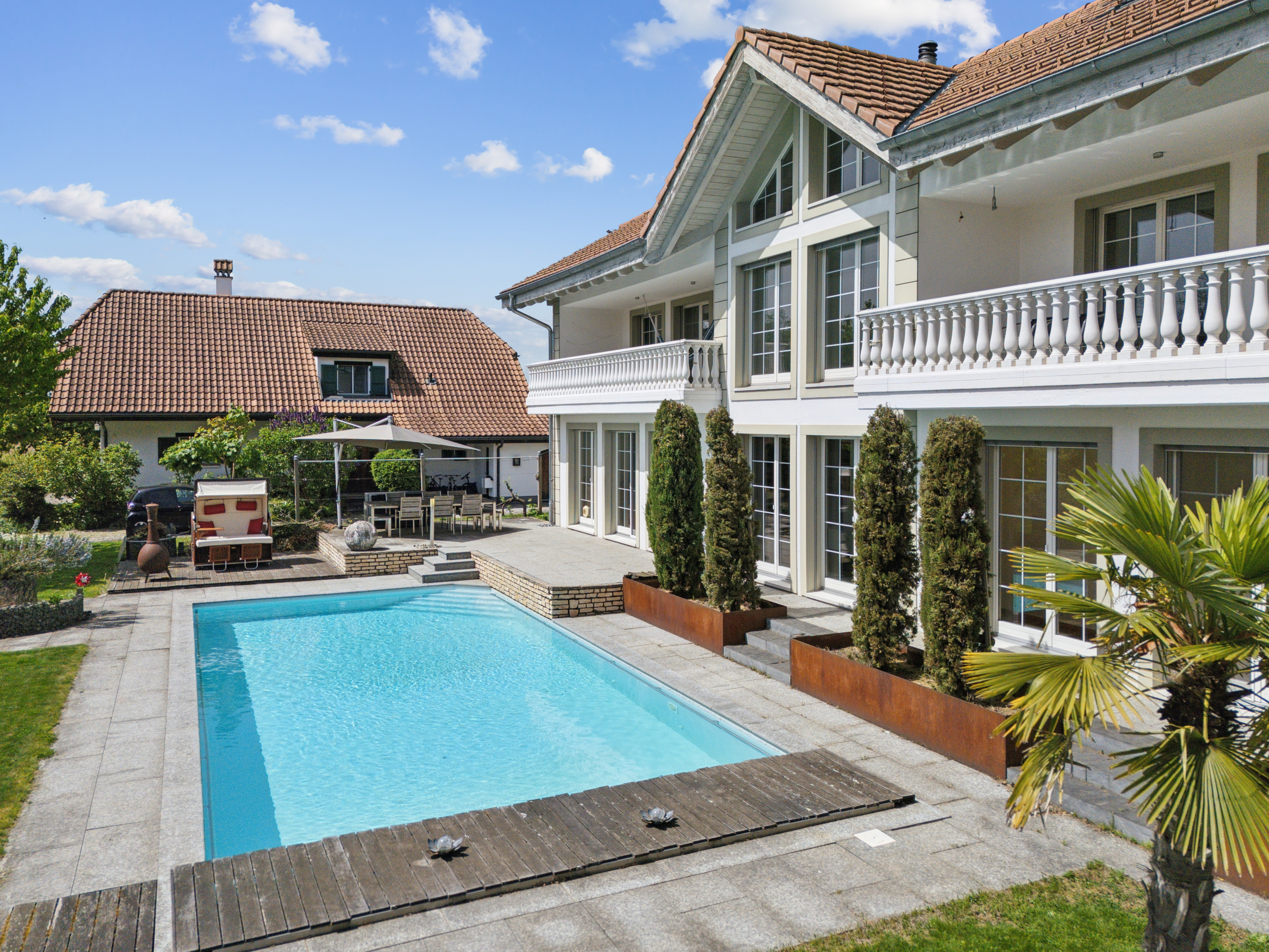Villa in Gurbrü BE | Diese exklusive 10.5-Zimmer-Villa mit Gästehaus liegt idyllisch im Berner Seeland und bietet modernen Wohnkomfort auf einem grosszügigen Grundstück. Bereits die elegante Zufahrt und der repräsentative Vorplatz mit mehreren Parkplätzen setzen ein stilvolles Statement. Im Inneren begeistern lichtdurchflutete Wohnräume, eine hochwertige Küche und ein Cheminée, das Wärme und Eleganz verbindet. Der Aussenbereich punktet mit einer traumhaften Gartenlandschaft, Pool, Whirlpool und grosszügigen Sitzplätzen. Das Untergeschoss bietet mit einem klimatisierten Weinkeller ein besonderes Highlight für Geniesser. Das separate Gästehaus schafft zusätzlichen Raum für Gäste, Familie oder Arbeit – und macht dieses Anwesen zu einer wahren Wohn-Oase.